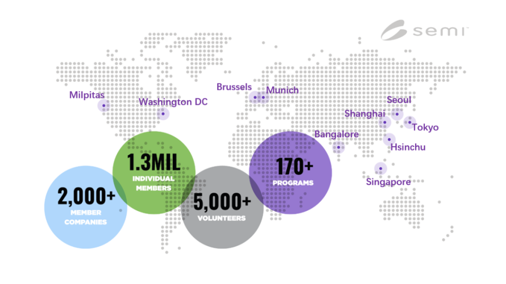 目前,SEMI 已經(jīng)連接了 2000 多家會員企業(yè)和全球 130 萬專業(yè)人士來共同推進(jìn)電子制造行業(yè)進(jìn)步,在全球有十幾個駐點,遍布美國、亞洲(新竹、首爾、上海、新加坡、東京)、印度、歐洲柏林和布魯塞爾。主辦的SEMICON展會有SEMICON China、SEMICON SEA、SEMICON Japan、SEMICON WEST、SEMICON Taiwan、SEMICON Europa、SEMICON Korea 等。??