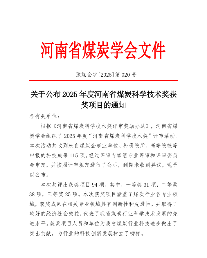 近日,河南省煤炭學(xué)會(huì)公布了2025年度“河南省煤炭科學(xué)技術(shù)獎(jiǎng)”評(píng)審結(jié)果。由光力科技牽頭及參與完成的兩項(xiàng)科技成果光榮上榜,榮獲一等獎(jiǎng)一項(xiàng),二等獎(jiǎng)一項(xiàng)。