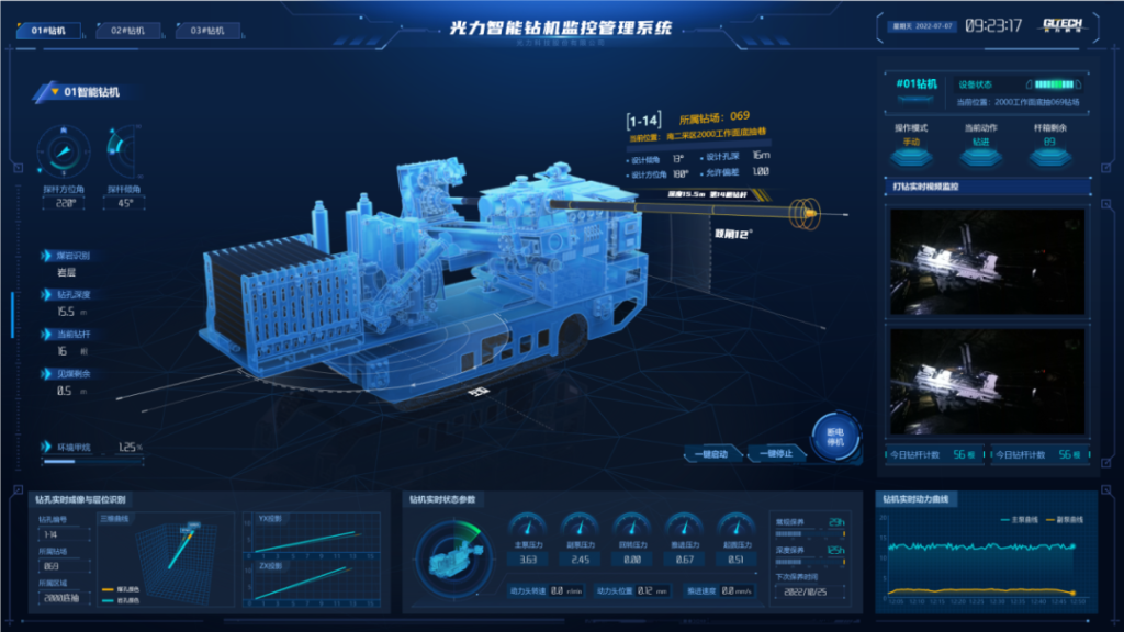 智能打鉆系統(tǒng)由鉆機主體、遙控器、無線分站、手機APP、上位機管理軟件組成,通過上位機的鉆孔管理軟件,實現(xiàn)鉆孔的自動設計、任務管理,配套打鉆視頻系統(tǒng)實現(xiàn)全過程的遠程監(jiān)控。主要用于煤礦井下瓦斯治理、水害防治、防突卸壓等安全施工鉆孔及地質(zhì)勘探鉆孔。減輕井下打鉆人員的勞動強度,保障井下打鉆人員的人身安全,可遠距離進行操作,遠離危險場景,提高打鉆效率。
